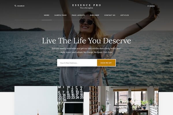 Essence is a simple and clutter-free WordPress theme for health, wellness, and lifestyle niches. It comes with a widget-ready home page layout where you can just drag and drop widgets to build your homepage. It is quite easy to use and very easy to set up. You can of course use this theme even if it’s not in the wellness niche, but be prepared to make more minor adjustments.