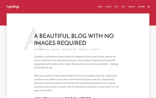 Typology is minimalism at its finest. If you’re looking for a simple theme that offers the best reading experience while still wowing readers, this is it. This is more of a “blog” theme rather than a business site theme, so if you’re looking to include lots of pictures and less text, this might not be the theme for you.