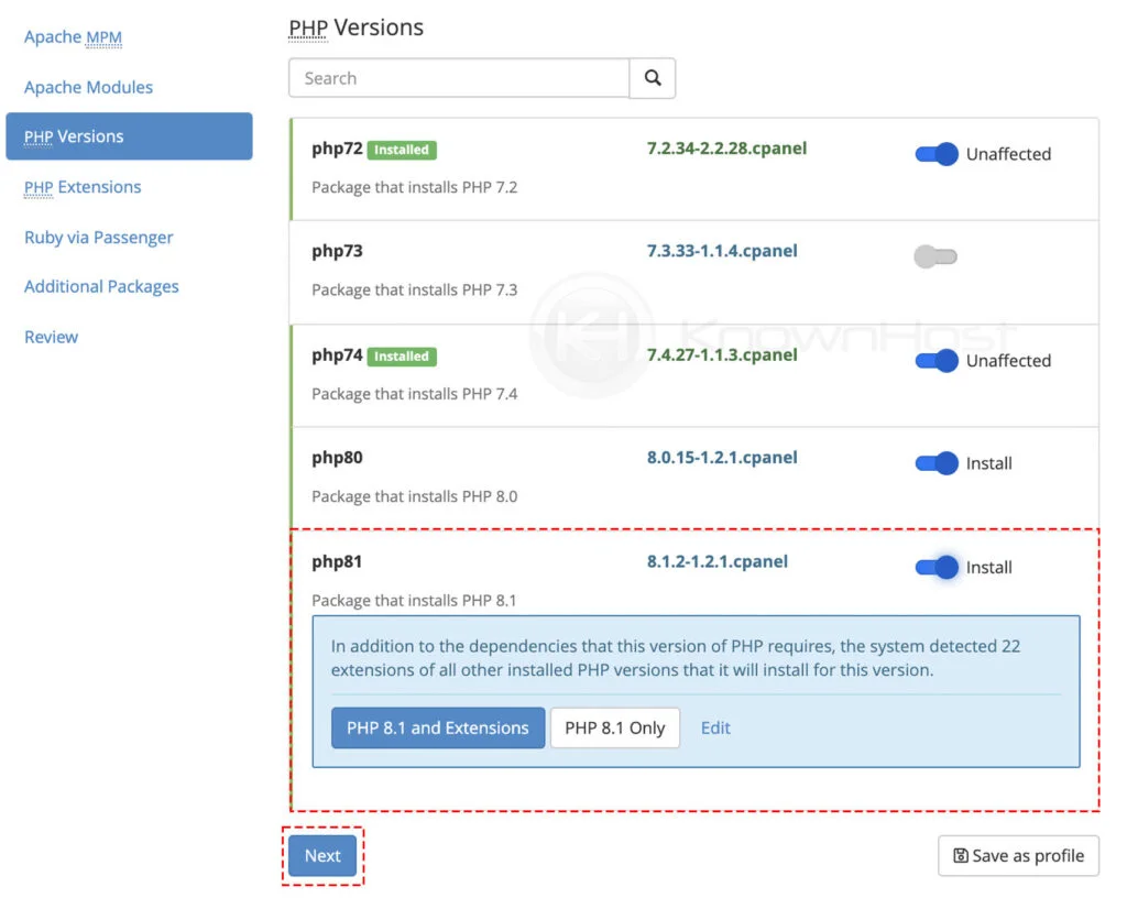 4. Now navigate to the PHP Versions → Select desired PHP version → (Optional) Select the option “PHP X.X and Extensions” or else you can continue without commonly used extensions → Click on Next.